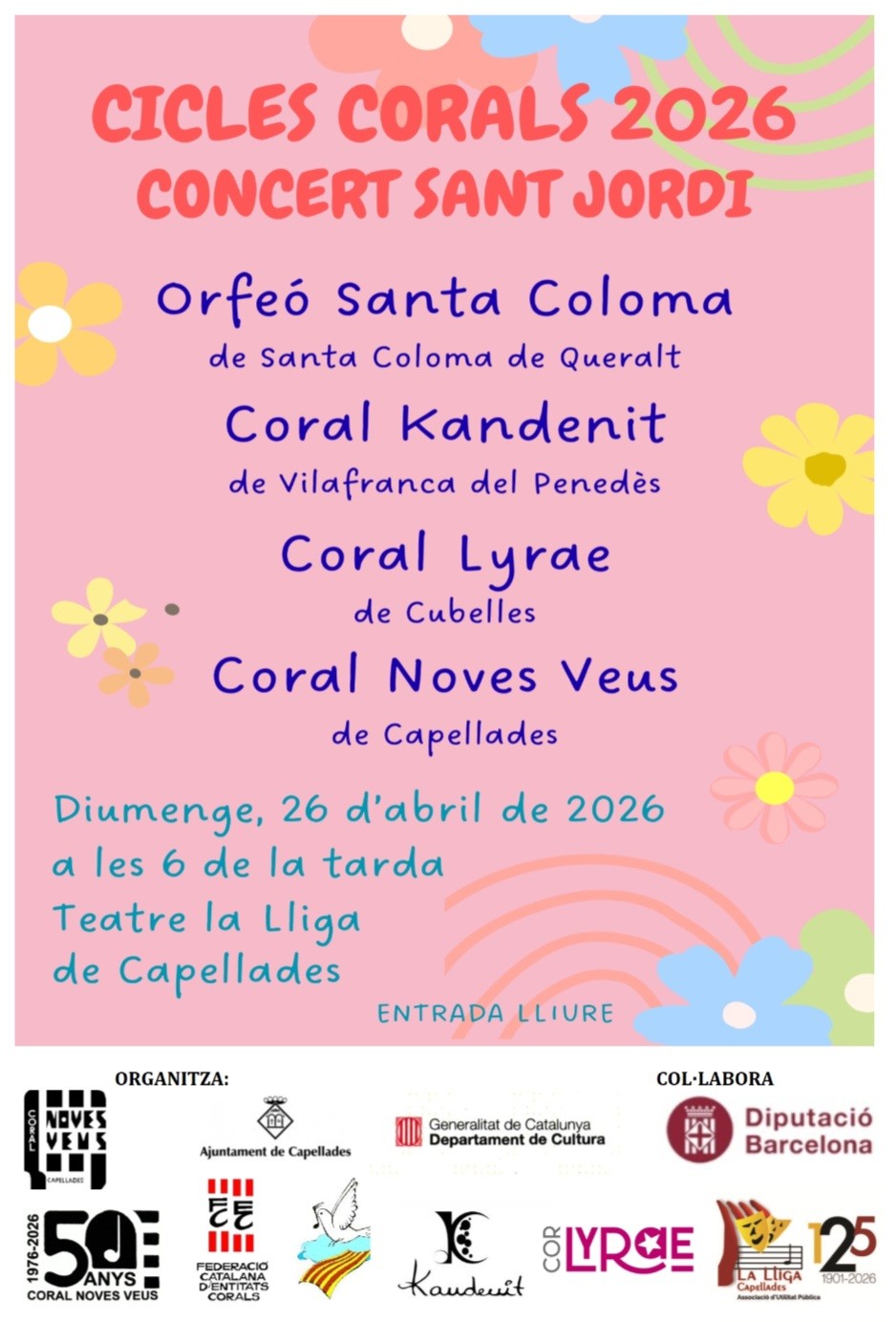 Per Sant Jordi la Coral Noves Veus organitza un concert amb 4 corals. A les 6 de la tarda i al Teatre La Lliga es podrà escoltar, amb entrada lliure, l’Orfeó de Santa Coloma, de Santa Coloma de Queralt; la Coral Kandenit, de Vilafranca del Penedès; la Coral Lyrae, de Cubelles i la mateixa Coral Noves Veus, de Capellades.